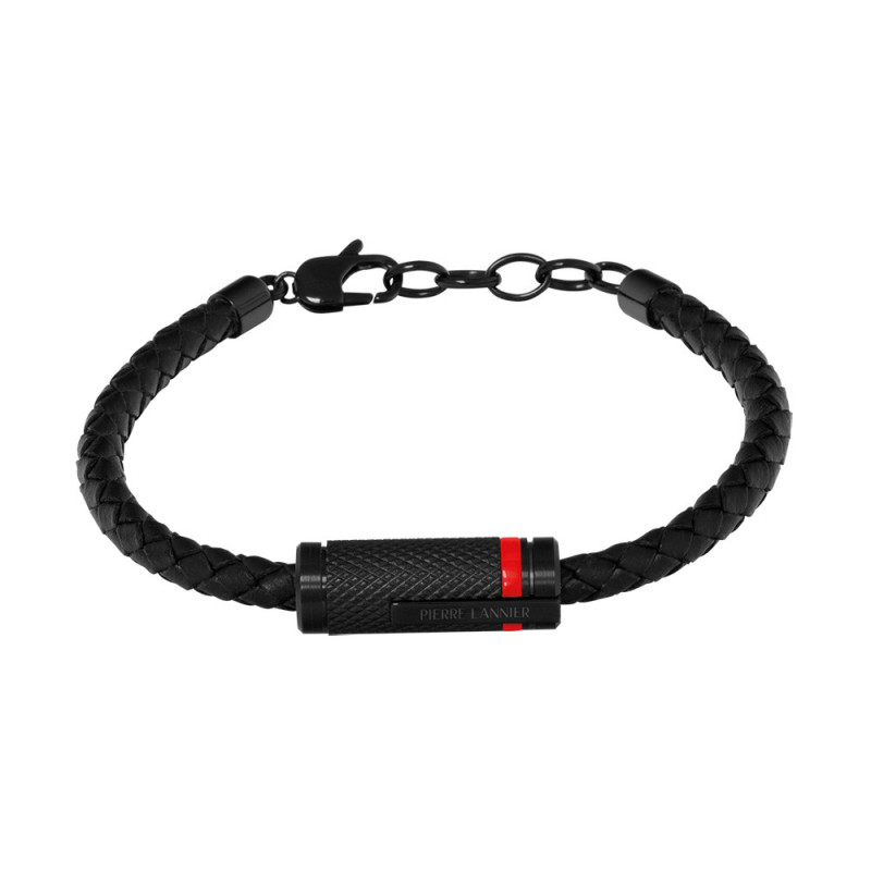 Bracelet PADDOCK Homme BJ40A1551 en cuir noir tressé avec tube métallique et accent rouge.